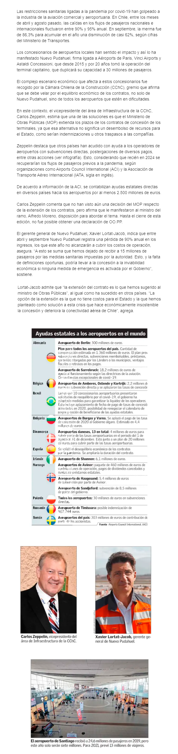 EL MERCURIO – El complejo escenario económico que afecta a estos concesionarios fue recogido por la Cámara Chilena de la Construcción, gremio que afirma que se debe velar por el equilibrio económico de los contratos, no solo de Nuevo Pudahuel, sino de todos los aeropuertos que estén en dificultades.