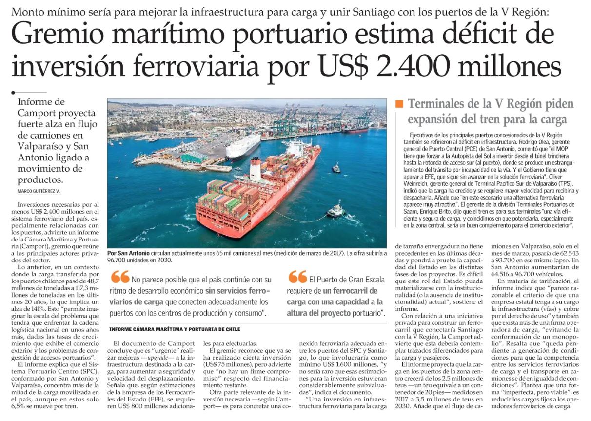 EL MERCURIO – Inversiones necesarias por al menos US$ 2.400 millones en el sistema ferroviario del país, especialmente relacionadas con los puertos, advierte un informe de la Cámara Marítima y Portuaria (Camport), gremio que reúne a los principales actores privados del sector. Lo anterior, en un contexto donde la carga transferida por los puertos chilenos pasó de 48,7 millones de toneladas a 117,3 millones de toneladas en los últimos 20 años, lo que implica un alza de 141%. Esto “permite imaginar la escala del problema que tendrá que enfrentar la cadena logística nacional en unos años más, dadas las tasas de crecimiento que exhibe el comercio exterior y los problemas de congestión de accesos portuarios”. El informe explica que el Sistema Portuario Centro (SPC), conformado por San Antonio y Valparaíso, concentra más de la mitad de la carga movilizada en el país, aunque en estos solo 6,5% se mueve por tren.