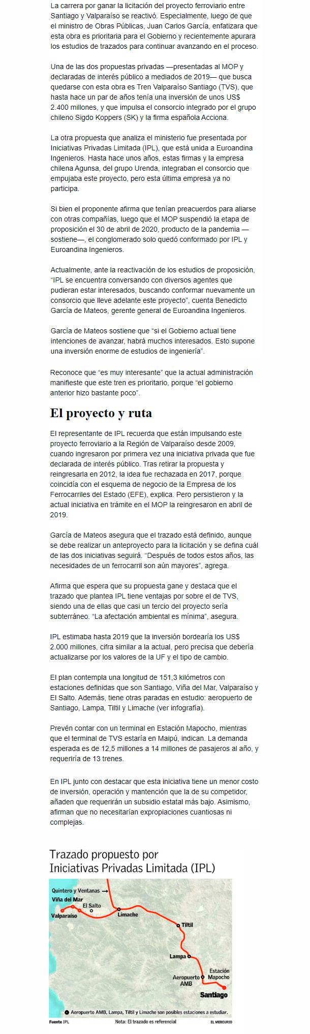 EL MERCURIO – El ferrocarril que pretende desarrollar este proponente costaría alrededor de US$ 2.000 millones, con un trazado de 151 kilómetros que tendría un terminal en la Estación Mapocho.