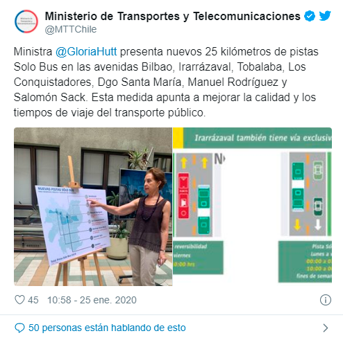 La experta en transportes Marcela Munizaga, académica de la Univerrsidad de Chile, destacó que “las pistas ‘sólo bus’ y los corredores logran ordenar el flujo, y en definitiva si mejoras la claridad del transporte público, y menos gente usa auto, la congestión disminuye” y además disminuye emisiones de carbono.