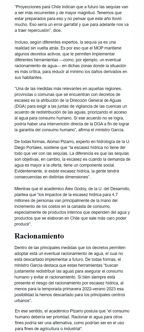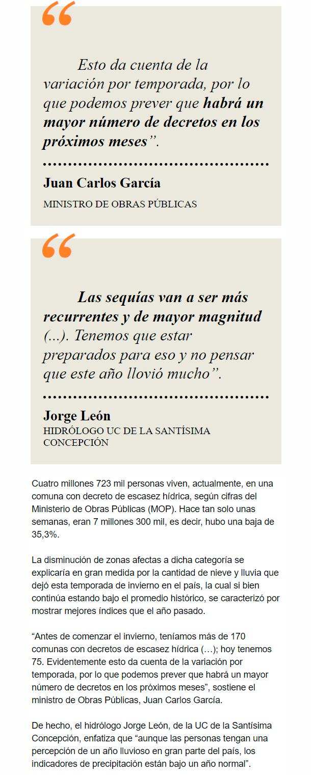 EL MERCURIO – Titular del MOP prevé que, como es una baja estacional, “habrá un mayor número de decretos en los próximos meses”. Especialistas piden que el país se prepare ante la escasez del agua.