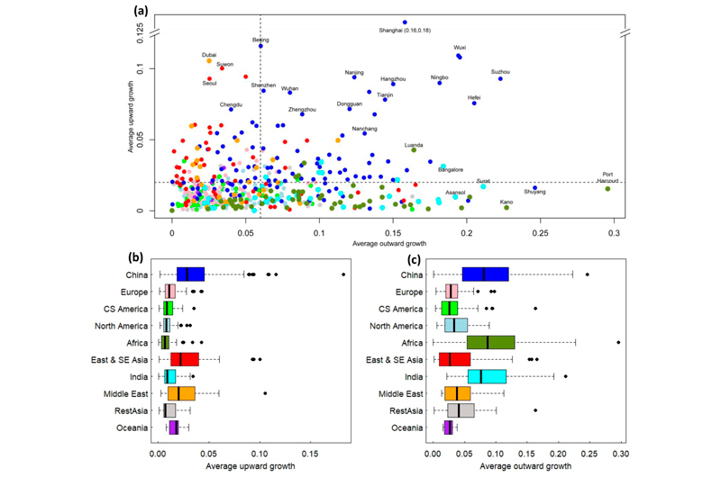 Un estudio de tipología de crecimiento urbano de 2019 analizó datos satelitales en 478 ciudades con más de un millón de habitantes. El siguiente gráfico muestra las tendencias de verticalización y expansión de las áreas urbanas en todo el mundo.