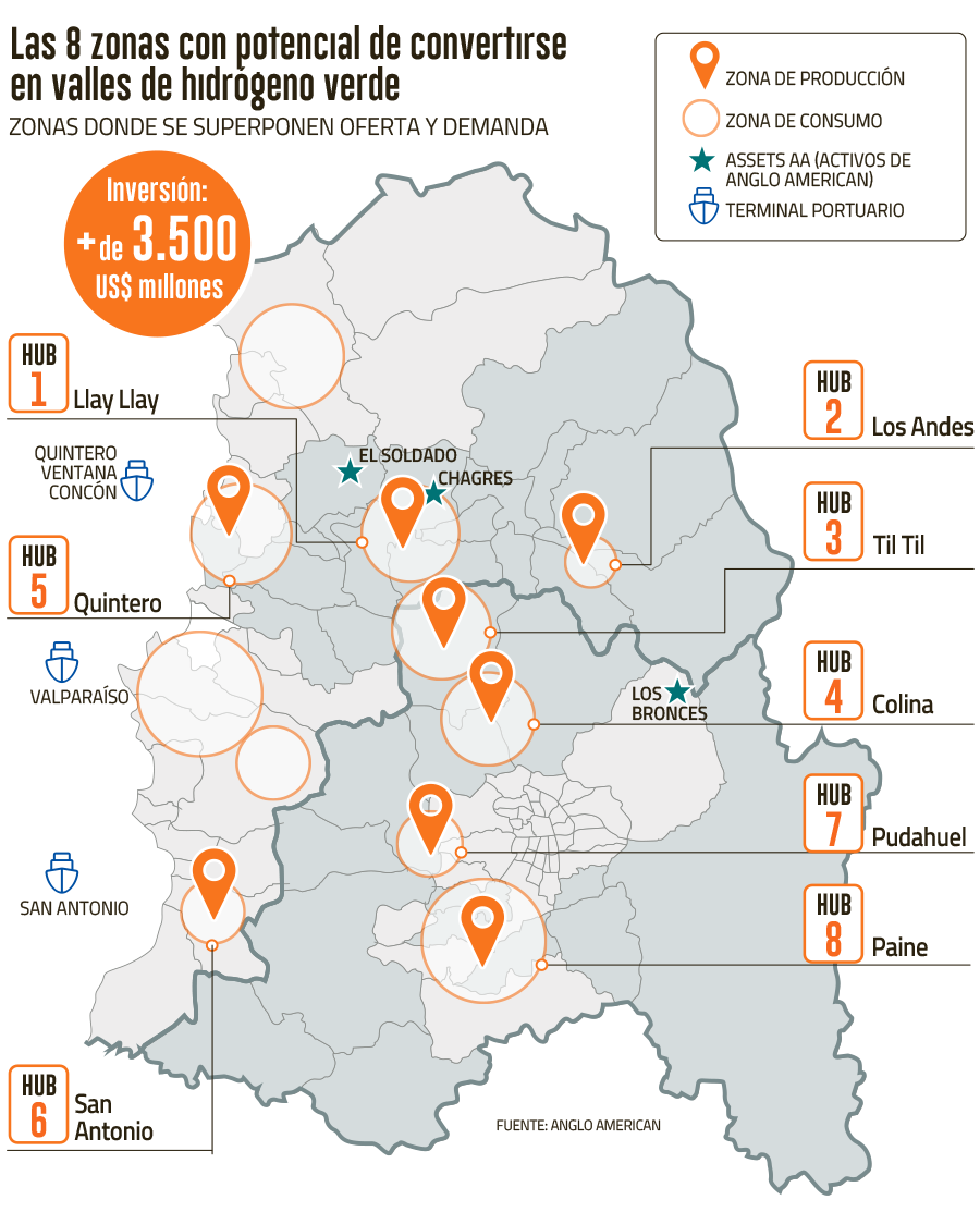 Las ocho localidades con potencial para desarrollar hidrógeno verde en la zona central: Pudahuel, Til Til, Colina y Paine en la Región Metropolitana, y Llay Llay, Los Andes, Quintero y San Antonio en la V Región (ver infografía)