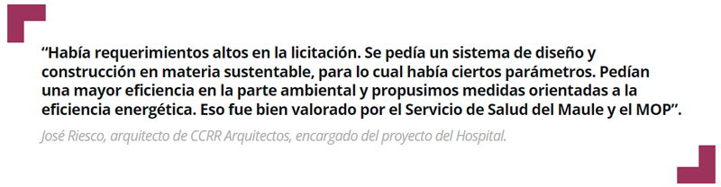 “Había requerimientos altos en la licitación. Se pedía un sistema de diseño y construcción en materia sustentable, para lo cual había ciertos parámetros. Pedían una mayor eficiencia en la parte ambiental y propusimos medidas orientadas a la eficiencia energética. Eso fue bien valorado por el Servicio de Salud del Maule y el MOP. Fue muy bueno conversar con la gente de CES para definir criterios; por ejemplo, en lo que respecta a la iluminación natural”, dice José Riesco, arquitecto de CCRR Arquitectos.