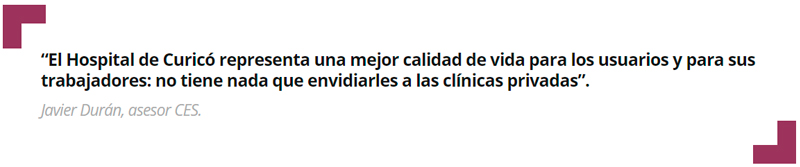 Durán, en tanto, el sistema de recuperación de calor es el que hace posible bajar la demanda de energía, para que la iluminación natural fluya al interior del recinto, y cumpla con las características de confort. “Los requerimientos en la licitación del Servicio de Salud eran bastante exigentes”, comenta el asesor CES, quien recuerda que el de Curicó es el segundo hospital en certificarse, después del Hospital de Quillota. Claro que éste, por su menor superficie de construcción, obtuvo un nivel de certificación más bajo que el recinto asistencial de la Región del Maule. “El Hospital de Curicó representa una mejor calidad de vida para los usuarios y para sus trabajadores: no tiene nada que envidiarles a las clínicas privadas”, complementa Durán.
