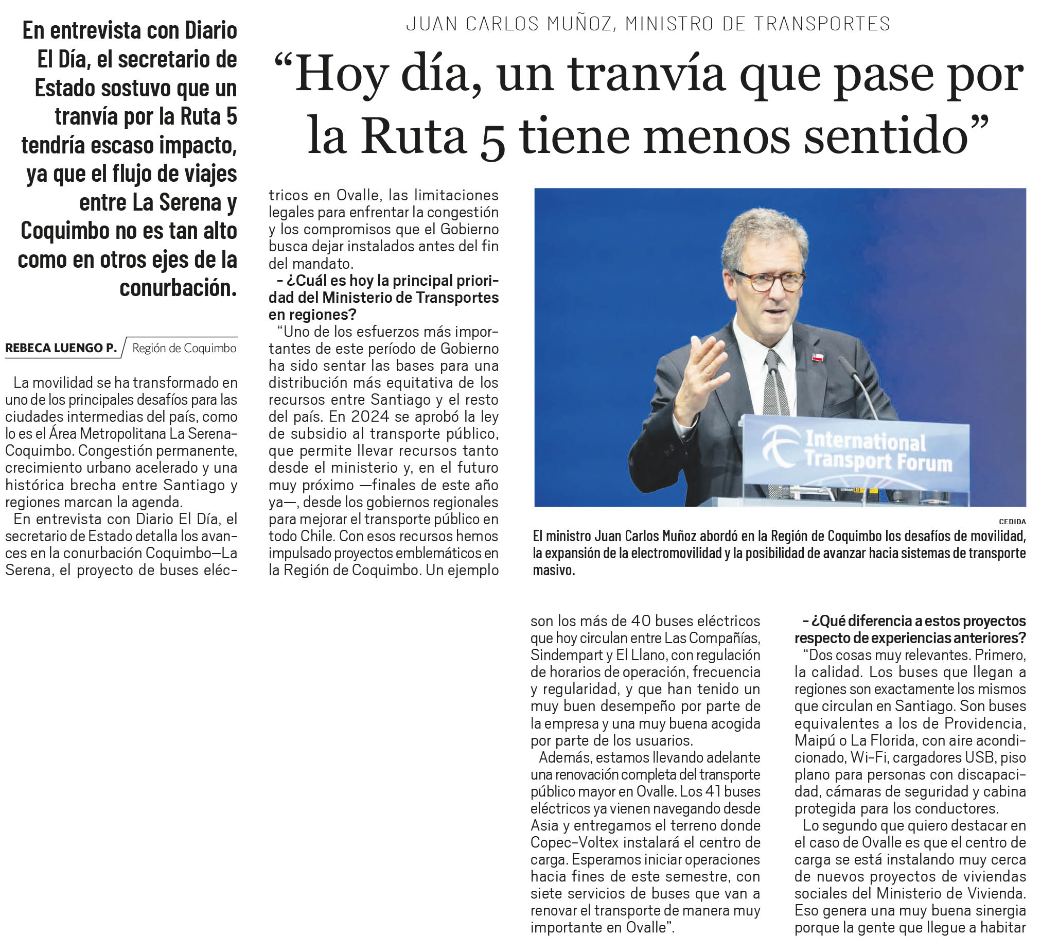 EL DÍA – El ministro Juan Carlos Muñoz abordó en la Región de Coquimbo los desafíos de movilidad, la expansión de la electromovilidad y la posibilidad de avanzar hacia sistemas de transporte masivo