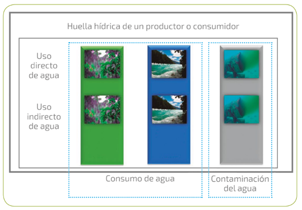 Otra característica relevante de la huella del agua es que, a diferencia de otros indicadores que cuantifican exclusivamente la captación o consumo de aguas superficiales o subterráneas (agua azul), la metodología de la WFN también considera en su cálculo el volumen de aguas lluvias que es apropiado desde el suelo (agua verde), y el volumen de agua necesario para diluir los contaminantes generados por las actividades humanas hasta un nivel ambientalmente tolerable (agua gris) (Figura 1).