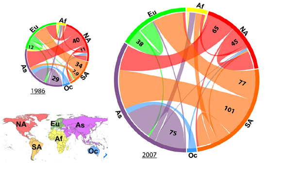 Flujos de “agua virtual” asociados al comercio internacional de alimentos para los años 1986 y 2007 (en km3 anuales) (Dalin et al. 2019).