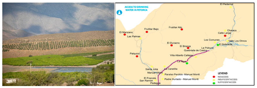 a) Plantaciones de paltos en Petorca (Global Citizen, 2019). b) Situación de acceso al agua potable en la misma zona (Muñoz et al. 2020).