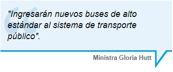 La ministra Gloria Hutt afirmó que con el nuevo esquema “ingresarán más buses de alto estándar al sistema de transporte público, como los eléctricos y ecológicos que ya hemos conocido”. Los primeros tendrán un contrato por 14 años mientras que los segundos, 10 años.
