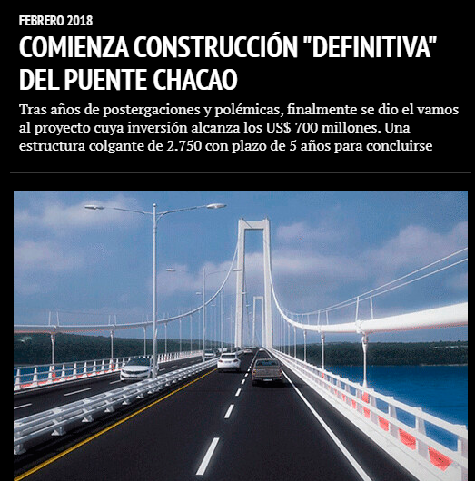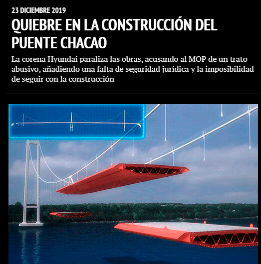 DIARIO FINANCIERO – A las 11:09 de este lunes 23 de diciembre, Hyundai Engineering & Construction, controlador del Consorcio Puente Chacao (CPC), que levanta una estructura colgante para unir el continente con la isla de Chiloé, notificó al Ministerio de Obras Públicas que no continuará con los trabajos, los que ya habían terminado los 36 pilotes de la nave central y se aprontaba a iniciar otras fases del desarrollo de la estructura.