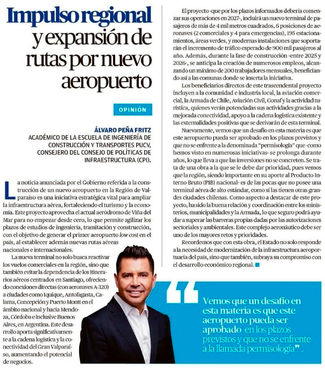 EL MERCURIO DE VALPARAÍSO – Vemos un desafío en esta materia es que este aeropuerto pueda ser aprobado en los plazos previstos y que no se enfrente a la llamada permisología