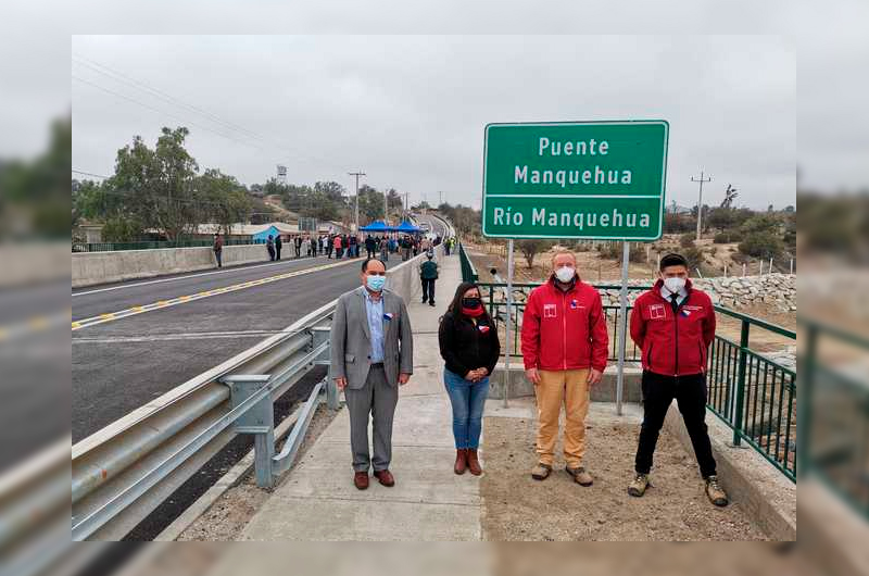 Por su parte el delegado presidencial Pablo Herman, recalcó que “en la región tenemos algunos puentes que hemos tenido que ir revisando, precisamente porque tienen algunos daños o por que deben adecuarse a la nueva normativa sísmica. En este caso, el diseño original de este puente tuvo deficiencias y tuvimos que efectuar un nuevo diseño y así entregar una mejor caja en la quebrada, entendiendo que por el cambio climático llueve menos, pero cuando sucede lo hace con mayor cantidad de milímetros y eso trae mayor cantidad de agua y por ende se hicieron todos los estudios para poder llegar a un puente que hoy es muy bienvenido por la comunidad de Manquehua”.