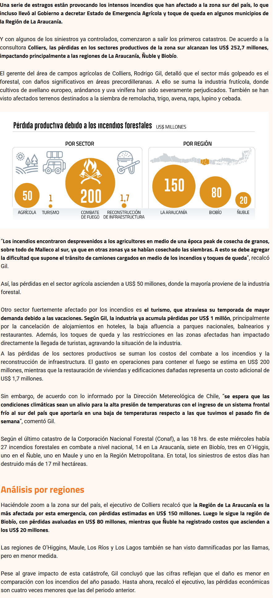 DIARIO FINANCIERO – La Araucanía, Biobío y Ñuble son las regiones más afectadas por las llamas. Desde Colliers indicaron que las pérdidas económicas son cuatro veces menores que las del año anterior.