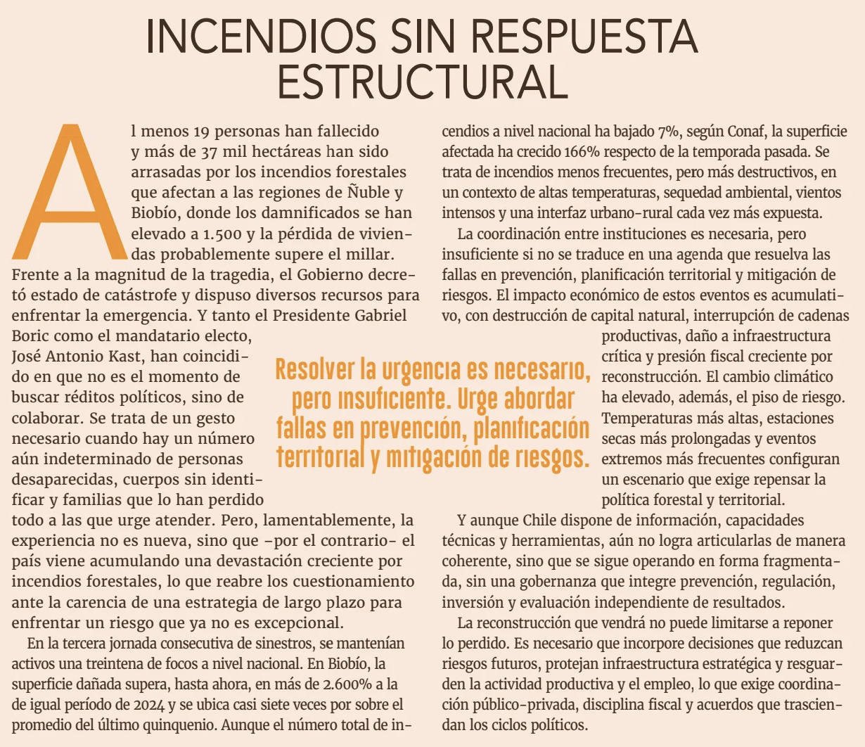 DIARIO FINANCIERO – Resolver la urgencia es necesario, pero insuficiente. Urge abordar fallas en prevención, planificación territorial y mitigación de riesgos