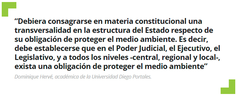 “Debiera consagrarse en materia constitucional una transversalidad en la estructura del Estado respecto de su obligación de proteger el medio ambiente. Es decir, debe establecerse que en el Poder Judicial, el Ejecutivo, el Legislativo, y a todos los niveles -central, regional y local-, exista una obligación de proteger el medio ambiente. A su vez, que sea eficaz, que se cumpla, y por lo tanto que el Estado establezca esta garantía de la efectividad de la protección del medio ambiente”, planteó.