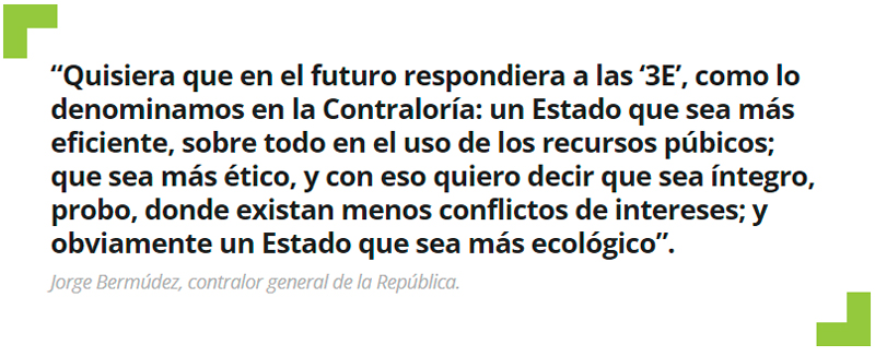 En lo que respecta al rol del Estado en su conjunto, dijo Jorge Bermúdez, “quisiera que en el futuro respondiera a las ‘3E’, como lo denominamos en la Contraloría: un Estado que sea más eficiente, sobre todo en el uso de los recursos púbicos; que sea más ético, y con eso quiero decir que sea íntegro, probo, donde existan menos conflictos de intereses; y obviamente un Estado que sea más ecológico”.