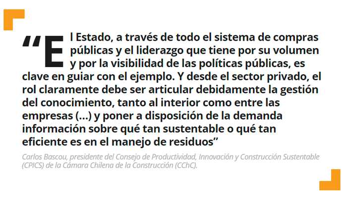 Desde lo privado, las principales falencias hoy están marcadas por una deficiente integración y coordinación entre todos los actores de la cadena de valor, así como poco eficiencia en el uso de recursos materiales y procesos, lo que genera una escasa competitividad. A esto se suma la ausencia de información y de trazabilidad de los residuos de construcción y demolición, que dificultan el diseño e implementación de políticas públicas y el fomento de mercados para la valorización de estos residuos. Hay, entonces, una falla del mercado y del Estado.