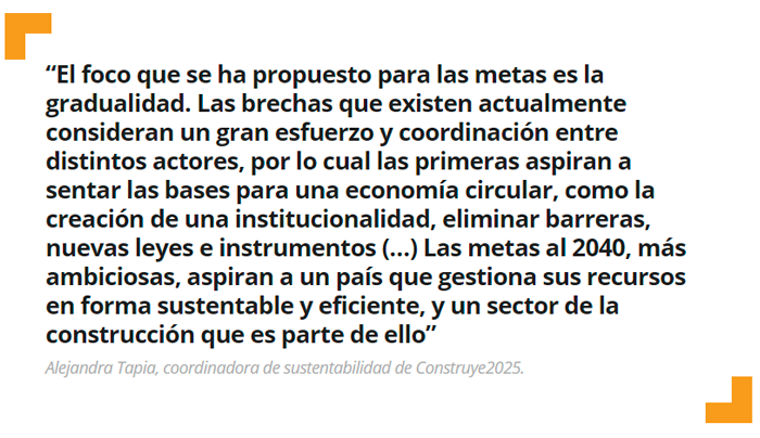 “El foco que se ha propuesto para las metas entre ambos años es la gradualidad, por una parte, las brechas que existen actualmente consideran un gran esfuerzo y coordinación entre distintos actores, por lo cual las primeras aspiran a sentar las bases para una economía circular, como la creación de una institucionalidad, eliminar barreras, nuevas leyes e instrumentos. Estos procesos, por su naturaleza, implican un período considerable para su realización. Las metas al 2040, más ambiciosas, aspiran a un país que gestiona sus recursos en forma sustentable y eficiente, y un sector de la construcción que es parte de ello”, dice Alejandra Tapia.
