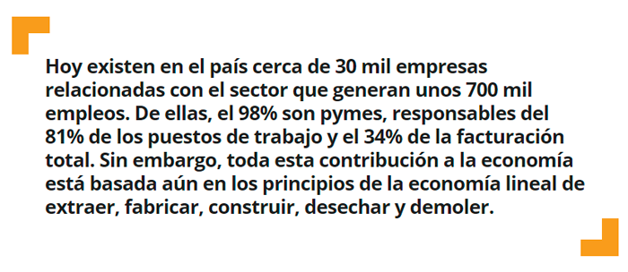Hoy existen en el país cerca de 30 mil empresas relacionadas con el sector que generan unos 700 mil empleos. De ellas, el 98% son pymes, responsables del 81% de los puestos de trabajo y el 34% de la facturación total. Sin embargo, toda esta contribución a la economía está basada aún en los principios de la economía lineal de extraer, fabricar, construir, desechar y demoler.