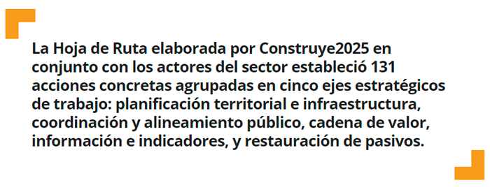 En este escenario, la Hoja de Ruta elaborada por Construye2025 en conjunto con los actores del sector estableció cinco ejes estratégicos de trabajo: planificación territorial e infraestructura, coordinación y alineamiento público, cadena de valor, información e indicadores, y restauración de pasivos.