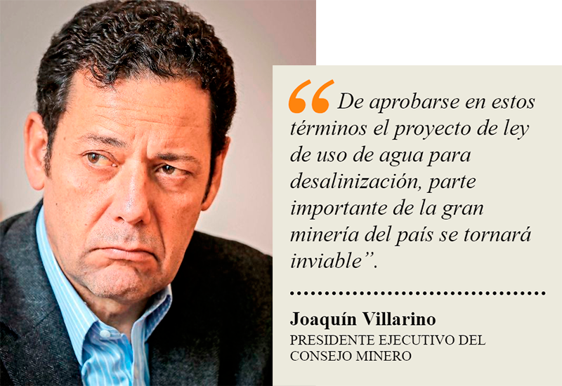 El presidente ejecutivo del Consejo Minero, Joaquín Villarino, sostuvo que la iniciativa se basa en una “errada tesis jurídica”, ya que les entrega la propiedad del agua desalada a todos los habitantes del país y no a quien la procesó, asimilándose a una expropiación. “Se podría limitar su extracción, pero nunca disponer del agua desalada. Además, dado que el agua de mar es, para todos los efectos prácticos, de disponibilidad ilimitada, nunca tendría sentido limitar su extracción”, detalló.