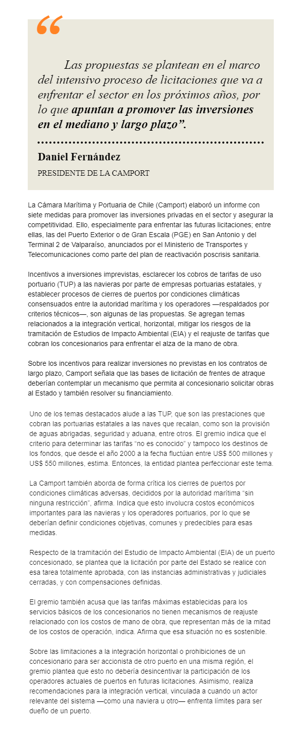 EL MERCURIO – Se plantean incentivos a inversiones imprevistas, esclarecer los cobros del Estado a las navieras y nuevos procedimientos para cerrar puertos por mal clima, entre otros.