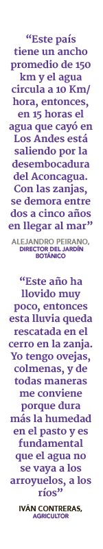 Peirano explica que instalaron zanjas -seis metros de largo, 40 centímetros de profundidad y 40 de ancho- en curvas de nivel medidas con una escuadra y sin necesidad de topógrafo, para retener agua de lluvia. “Este país tiene un ancho promedio de 150 km y el agua circula a 10 Km/hora, entonces, en 15 horas el agua que cayó en Los Andes está saliendo por la desembocadura del Aconcagua. Con las zanjas, se demora entre dos a cinco años en llegar al mar”, afirma.
