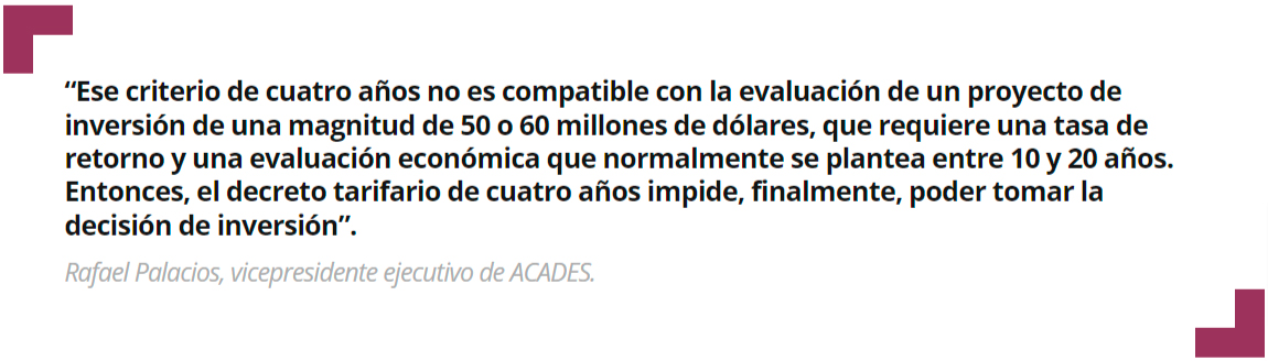 Ese criterio está ok, pero cuando entramos en proyectos que requieren inversiones relevantes, cuya rentabilidad se evalúa en horizontes de más largo plazo -10 o 15 años-, la incerteza que genera el que una decisión de la autoridad solamente se extiende por un periodo tan corto como cuatro años, echa abajo el negocio. Ese criterio de cuatro años no es compatible con la evaluación de un proyecto de inversión de una magnitud de 50 o 60 millones de dólares, que requiere una tasa de retorno y una evaluación económica que normalmente se plantea entre 10 y 20 años. Entonces, el decreto tarifario de cuatro años impide, finalmente, poder tomar la decisión de inversión.