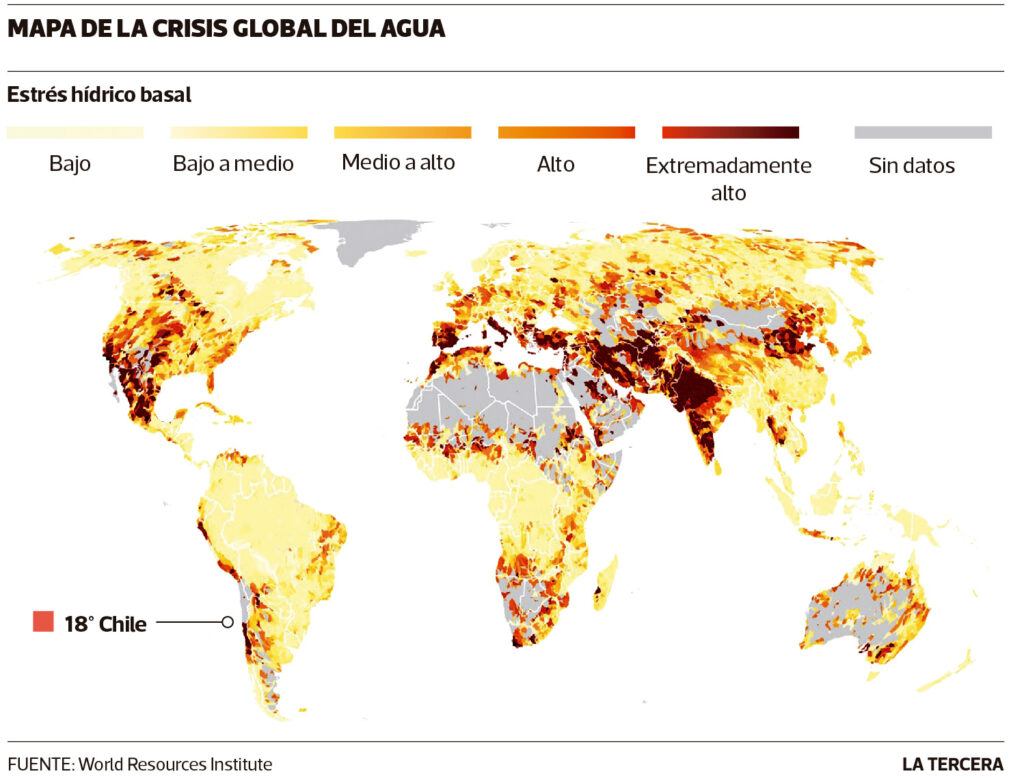 Otros 27 países, liderados por Chile, integran la escala siguiente, de países con “alto estrés hídrico”. “Si la subcuenca tiene un estrés hídrico alto o extremadamente alto, es probable que no todos los usuarios puedan acceder a toda el agua que necesitan para sus actividades personales y económicas, que disminuyan los niveles de agua subterránea, y algunos ríos incluso se pueden secar”, explica a La Tercera Charles Iceland, director de Iniciativas de Agua Globales y Nacionales del WRI. El experto agrega que en el centro de Chile hay un estrés hídrico extremadamente alto.