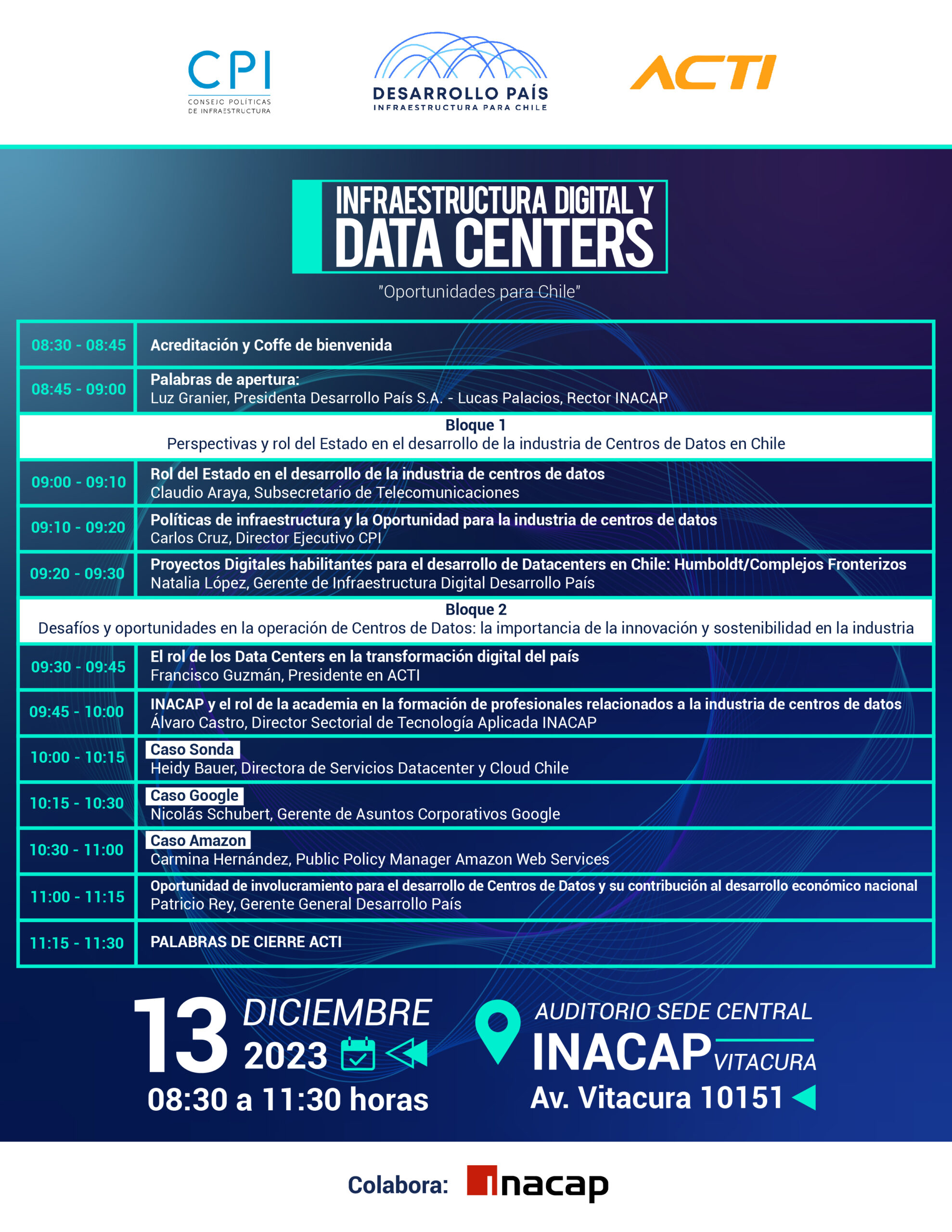 Invitación Infraestructura Digital y Data Centers By Estefania Rodriguez Noviembre 30, 2023 0 1197 Compartir WhatsAppLinkedinEmail CPI – Invitación a Encuentro “Infraestructura Digital y Data Center: Oportunidades para Chile”. Fuente: CPI, Jueves 23 de Noviembre de 2023 CPI – Invitación a Encuentro “Infraestructura Digital y Data Center: Oportunidades para Chile”. Fuente: CPI, Jueves 23 de Noviembre de 2023 Compartir WhatsAppLinkedinEmail Artículo anteriorDeuda financiera en la construcción casi se duplicó en últimos cuatro años y Gobierno evalúa comprar sobrestock de viviendasArtículo siguienteCámara de la Construcción plantea eliminar el IVA a viviendas para paliar el déficit habitacional TITULARES Martín Arrau y pagos del TAG: “Está sobre la mesa revisar la política tarifaria nacional” Titulares Diciembre 12, 2025 Expertos analizan impactos y proyecciones del Tren Limache-Puerto a 20 años de su puesta en marcha Titulares Diciembre 12, 2025 Brasil, México, Chile y Colombia lideran infraestructura digital Titulares Diciembre 12, 2025 Nuevo Bypass de Puchuncaví abre este 15 de diciembre: reduce viajes de 15 a 3 minutos y moderniza la Ruta F-20 Titulares Diciembre 12, 2025 Autoridades de Valparaíso llaman a candidatos presidenciales a potenciar la región Titulares Diciembre 12, 2025 Quien usa paga: el principio en juego por Marcela Ruiz-Tagle O. Titulares Diciembre 12, 2025 Ciudades Verdes: Una política que se juega en el diseño urbano por Montserrat del Pino Titulares Diciembre 12, 2025 Avanzan los proyectos de trenes Alameda-Melipilla y Melipilla-Batuco: EFE adjudica obras tecnológicas por $176 mil millones Titulares Diciembre 12, 2025