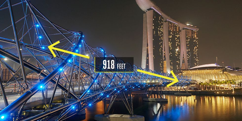 Inspirado en la forma del ADN, el puente Helix ofrece a los peatones de Singapur 280 metros de intriga arquitectónica y expresión artística. El puente en Marina Bay utiliza múltiples estilos de acero para curvarse, abriéndose en cinco puntos para plataformas de observación. Los tubos de acero son en sí un verdadero espectáculo visual. Si se enderezan y se colocan de extremo a extremo, se extenderían un total de 2.249 metros.