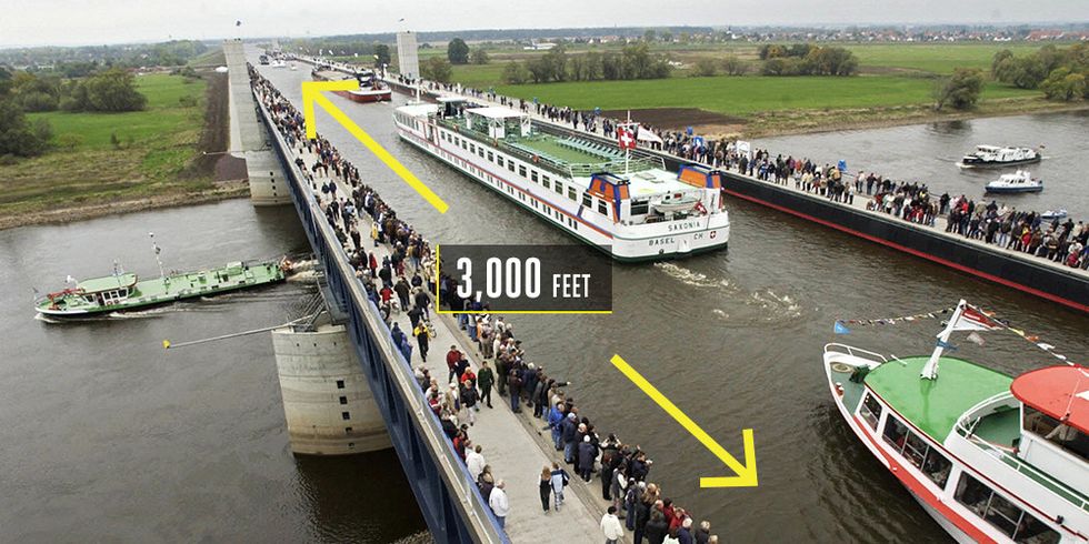 El puente de agua que cruza el río Elba para conectar el canal Elbe-Havel con el Mittellandkanal se convierte en el acueducto navegable más largo del mundo, con más de 915 metros de longitud. Anteriormente, la conexión de los dos canales requería un desvío de 11,9 kilómetros y un remonte en barco hacia el río. Pero en 2003, el nuevo puente acuático de hormigón cerca de Berlín cambió todo eso y proporcionó a los barcos una travesía acuática.