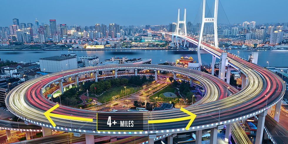 El puente de Nanpu cuenta con siete carriles y 762 metros de longitud sobre el río Huangpu. Pero, sinceramente, son los seis kilómetros de puente que no cruzan el río los que ofrecen la mayor intriga. Una aproximación circular elevada se extiende desde tierra llevando a los vehículos hacia la altura del puente en medio del congestionado centro de Shanghai.