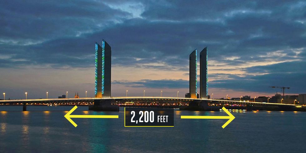 El puente de elevación vertical más largo de Europa, con una longitud de 671 metros, se eleva 76 metros sobre el río Garona en Burdeos (Francia). Los cuatro esbeltos pilones que sirven para la elevación vertical se iluminan para indicar la marea: azul para la marea alta y verde para la marea baja.