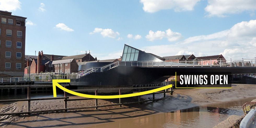 Los peatones pueden divertirse en Hull, Inglaterra, con un puente peatonal oscilante en lo que algunos denominan “apóstrofe” por su forma. Diseñado por McDowell+Benedetti e inaugurado en 2013, el puente de acero negro sirve para cruzar el río Hull, pero se abre al tráfico fluvial con un impresionante movimiento de balanceo.