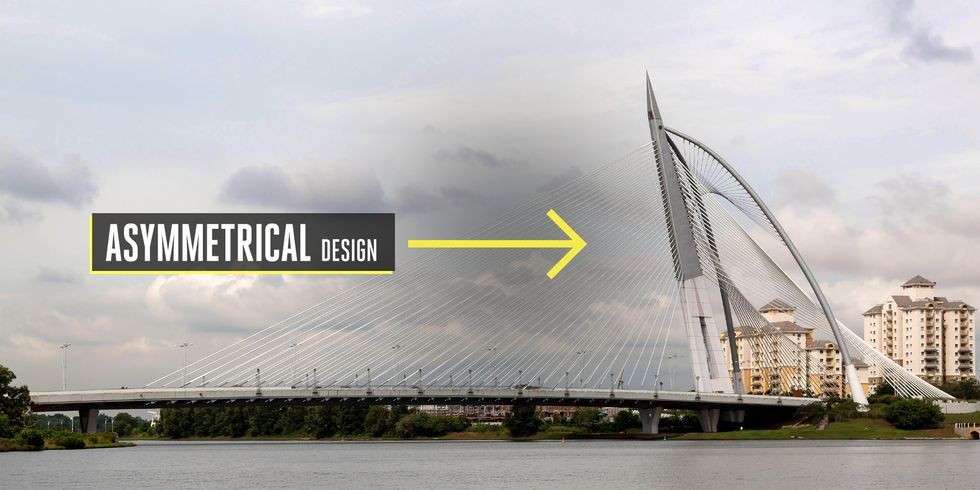 El diseño asimétrico sorprende en el puente Seri Wawasan sobre el lago de Putrajaya, en Malasia. Con un pilón de hormigón y acero en forma de “Y” invertida que se eleva a 96 metros de altura en uno de sus extremos, este puente de 240 metros de longitud impresiona tanto desde el punto de vista estético como desde el punto de vista de la ingeniería. Inaugurado en 2003, el pilón tiene el aspecto de un barco de vela y se ilumina por la noche para realzar su diseño curvo.