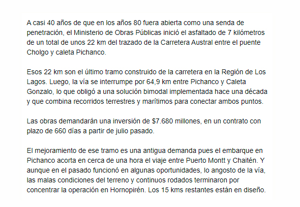 EL MERCURIO – Las obras abordarán 7 de los 22 km y demandarán una inversión de $7.680 millones.