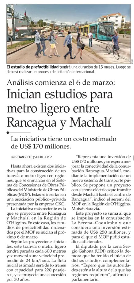 Inician estudios para metro ligero entre Rancagua y Machalí