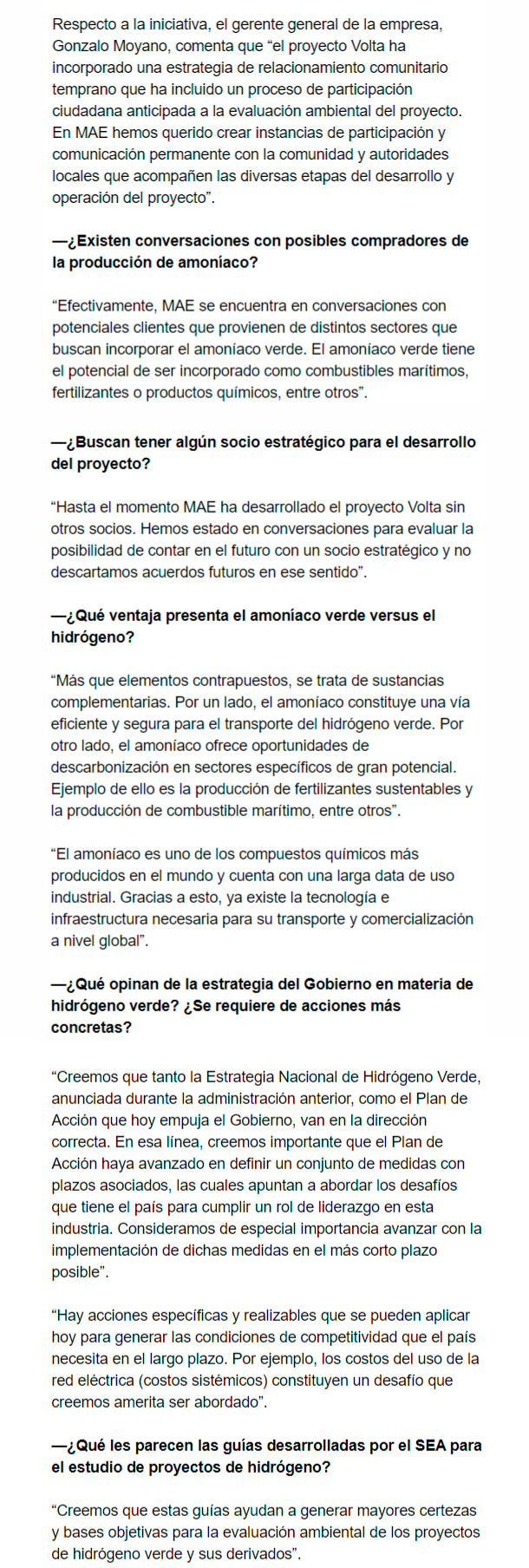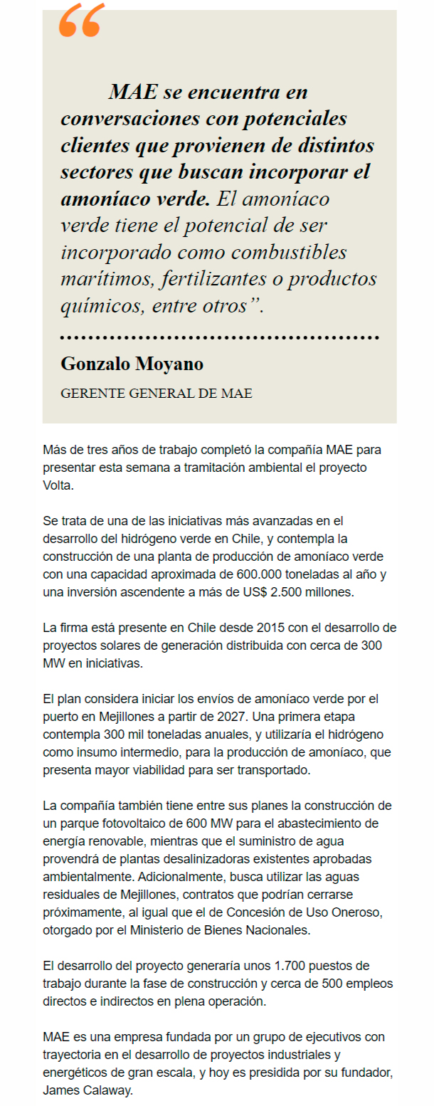EL MERCURIO – Se trata de una de las obras pioneras en esta materia, que se desarrollará en Mejillones, y utilizará la producción de hidrógeno verde como insumo intermedio