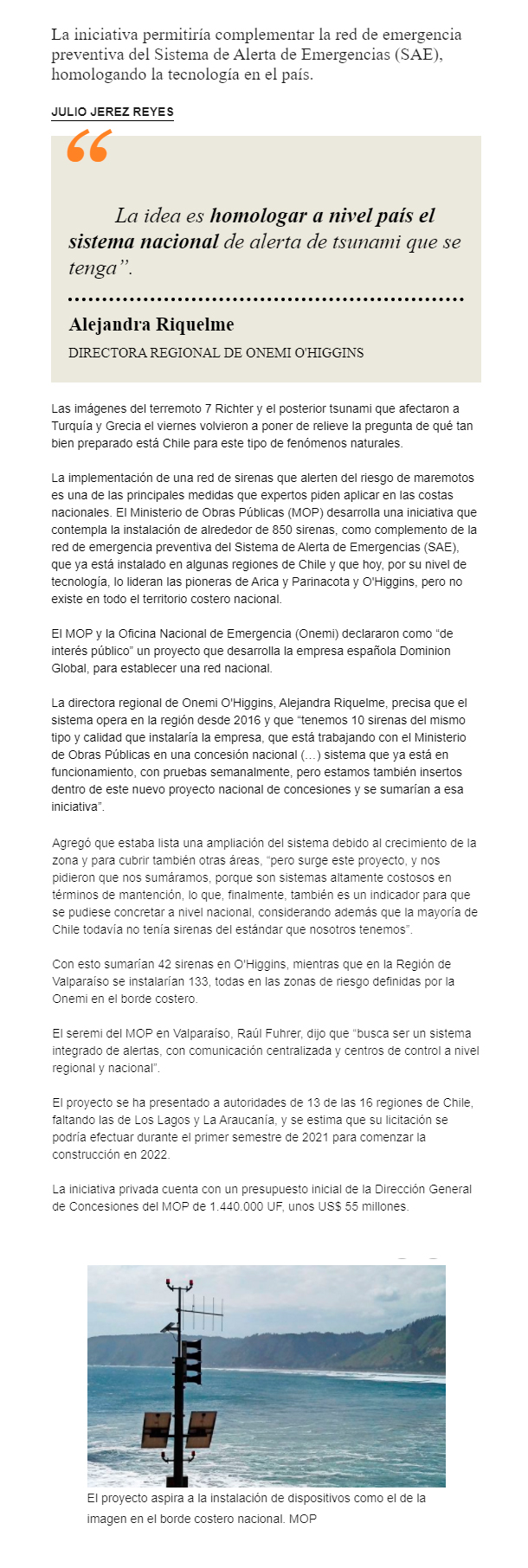 Instalarán más de 800 sirenas de alerta de tsunami en el territorio costero de Chile