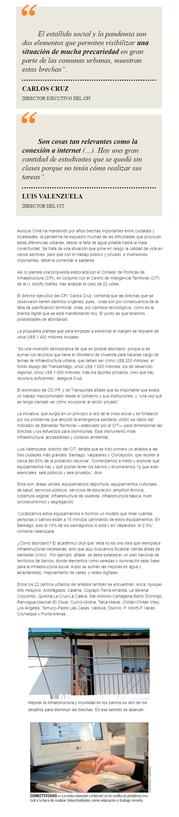 EL MERCURIO – Propuesta elaborada por el Consejo de Políticas de Infraestructura y La Universidad Adolfo Ibáñez – Expertos proponen revisar zonas críticas en cuanto a equipamientos y servicios y focalizar los recursos para abordar los principales problemas en los barrios.