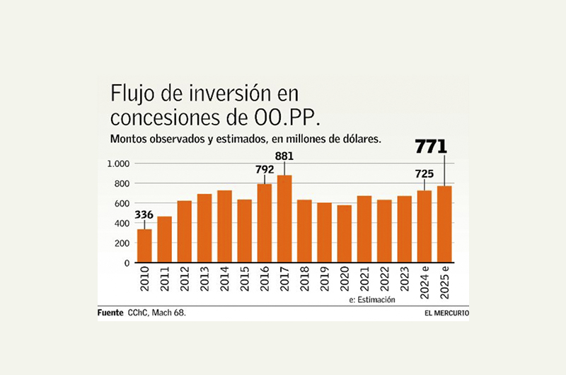 Considerando la cartera de obras en ejecución, se prevé que la inversión en construcción de concesiones —flujo anualizado a materializarse— alcance los US$ 771 millones en 2025. Ese monto representaría un avance de 6,3% anual, pero está por debajo de los peaks previos de 2017 (US$ 881 millones) y 2016 (US$ 792 millones), según el informe Mach