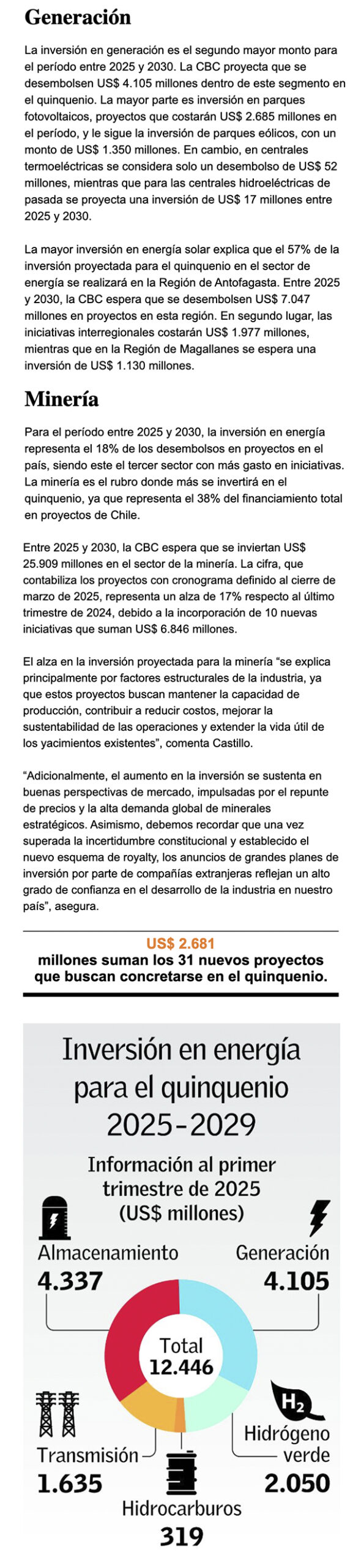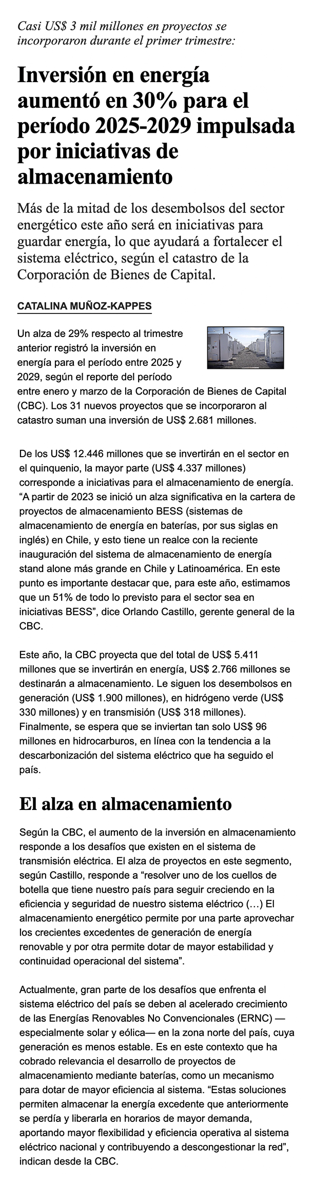 EL MERCURIO – Más de la mitad de los desembolsos del sector energético este año será en iniciativas para guardar energía, lo que ayudará a fortalecer el sistema eléctrico, según el catastro de la Corporación de Bienes de Capital.