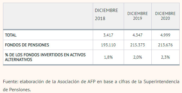 Según datos de la Asociación de AFP, la inversión en este tipo de instrumentos, alcanzó los US$ 4.973 millones a enero 2021, lo que representa un 2,3% de los fondos de pensiones.