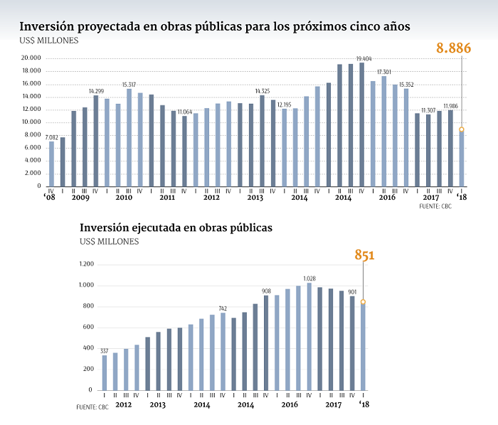 En un informe, la entidad advierte una fuerte caída en el catastro de proyectos de inversión en el sector obras públicas para el quinquenio 2018-2022, pasando de US$ 11.986 millones en el cuarto trimestre de 2017 a US$ 8.886 millones en el primer cuarto de este año. Esto implica una baja trimestral de 25,8%.