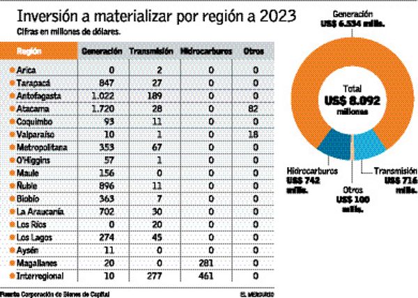 En el reporte de la CBC se detallan también los planes de inversión del sector energético a mediano plazo, apuntando a que al año 2023 habrá gastos por más de US$ 8.000 millones, impulsados principalmente por iniciativas ligadas al sector generación, en donde la lista es encabezada por las regiones de Antofagasta y Atacama.