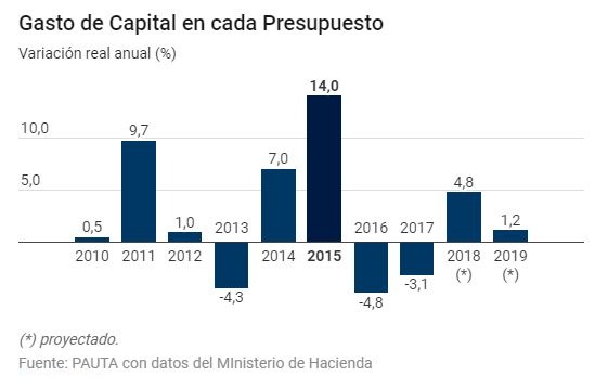 Según las cifras de la Dirección de Presupuestos, de los $47.742.991 millones que considera el presupuesto 2019, $7.737.227 millones corresponden a gasto de capital, monto que equivale al 3,5% del PIB.