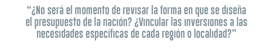 ¿No será el momento de revisar la forma en que se diseña el presupuesto de la nación? ¿Vincular las inversiones a las necesidades específicas de cada región o localidad? ¿Complementar inversiones entre sectores, adoptar instrumentos efectivos de coordinación y responsabilidad conjunta entre el gobierno central y regional para las decisiones de inversión pública, y considerar la articulación entre gobiernos regionales?