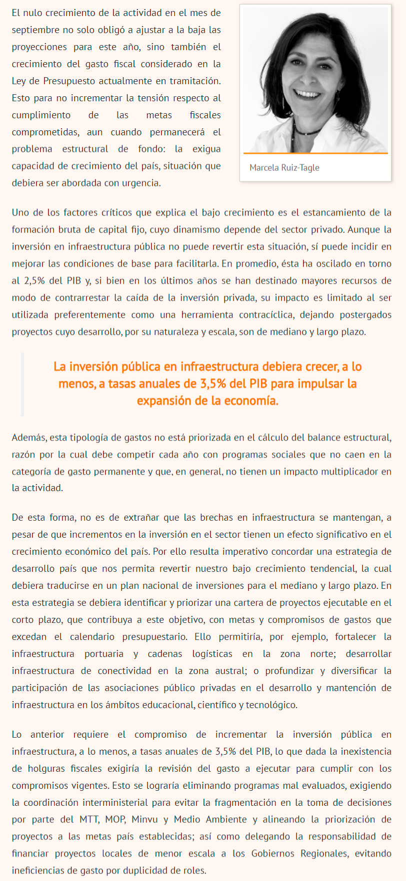DIARIO FINANCIERO – La inversión pública en infraestructura debiera crecer, a lo menos, a tasas anuales de 3,5% del PIB para impulsar la expansión de la economía